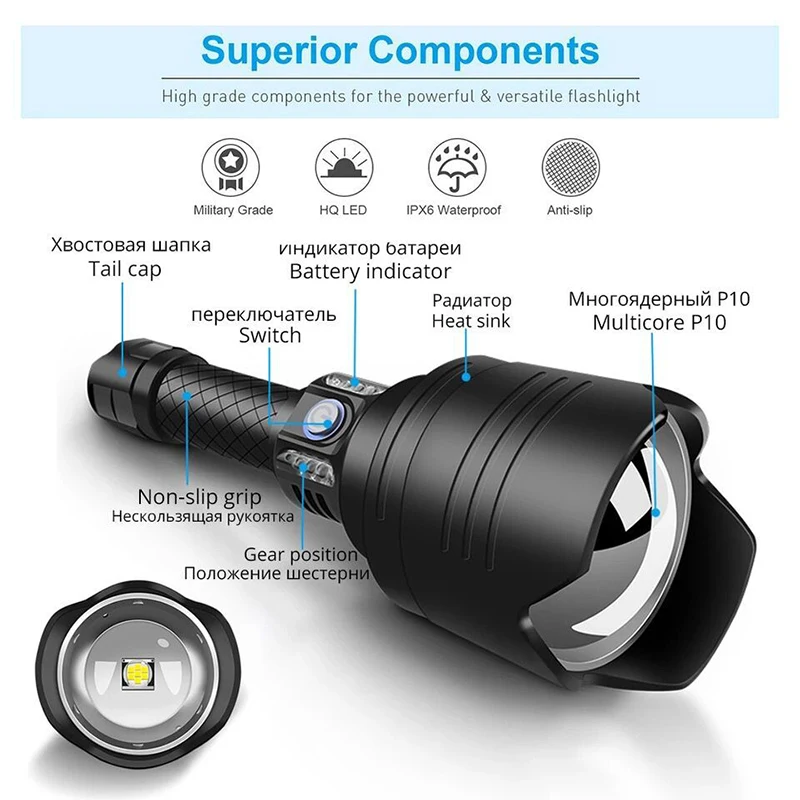 (23%OFF) Verkaufen 2020 NEUE Super 7core P10 LED Taschenlampe 52W 18650 Zoom Lampe Leistungsstarke Flutlicht Power Bank Camping Jagd Arbeit Schwarz Online