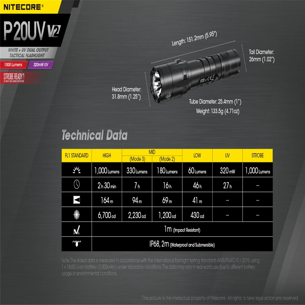 Product Name: NITECORE Taktische Taschenlampe P20UV V2 1000 Lumen UV Licht 320mW CREE XP-L2 V6 LED High-Leistungsstarke Led Taschenlampe